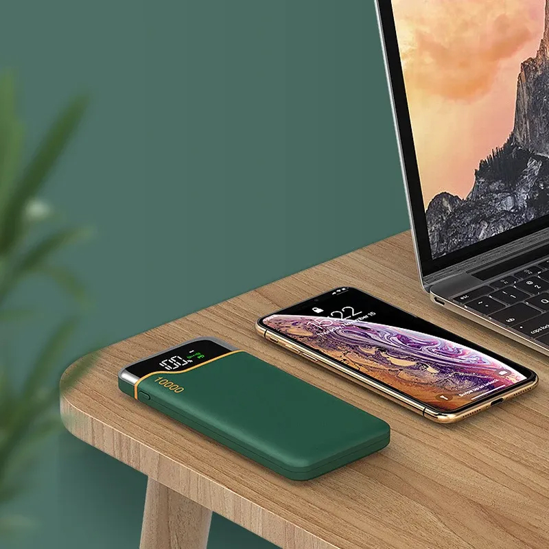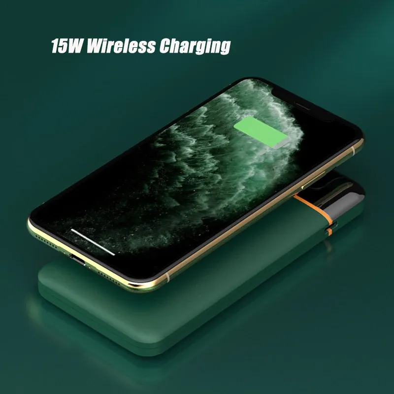 Type: Wireless Power Bank Maximum Input Power: 15w Material: Plastic Color: Dark-green Size:15x7.6cm Battery Type: Lithium Polymer Battery..
