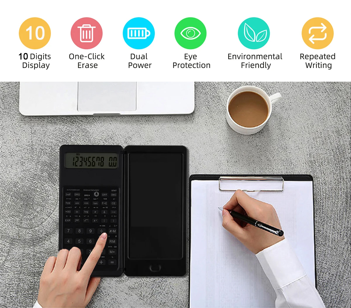 2 in 1 Foldable Solar Energy Calculator 10 Digits LCD Display Desktop With 6 Inch Writing Tablet Pen For Business School Office